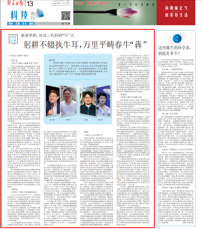 编者按 在很多人眼中,科研人身上自带牛的属性,优秀的科研工作者也被人们称为科研“大牛”。新春伊始,记者走访、对话了四位属牛的科研“牛人”,不管“大牛”还是“小牛”,是开拓创新的拓荒牛、甘为人梯的孺子牛,还是躬耕不辍的老黄牛……他们都有饱满的科研热情,以不怕苦、能吃苦的“牛劲”“牛力”,用创新点燃科技强国引擎。