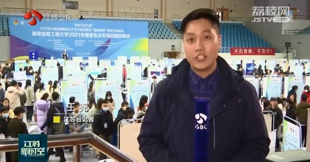 江苏台记者王尧说:“我现在在南京信息工程大学,这里是‘百校千企万岗’2021年江苏大学生就业帮扶活动的现场,超过200家企业与大学生面对面沟通交流。”