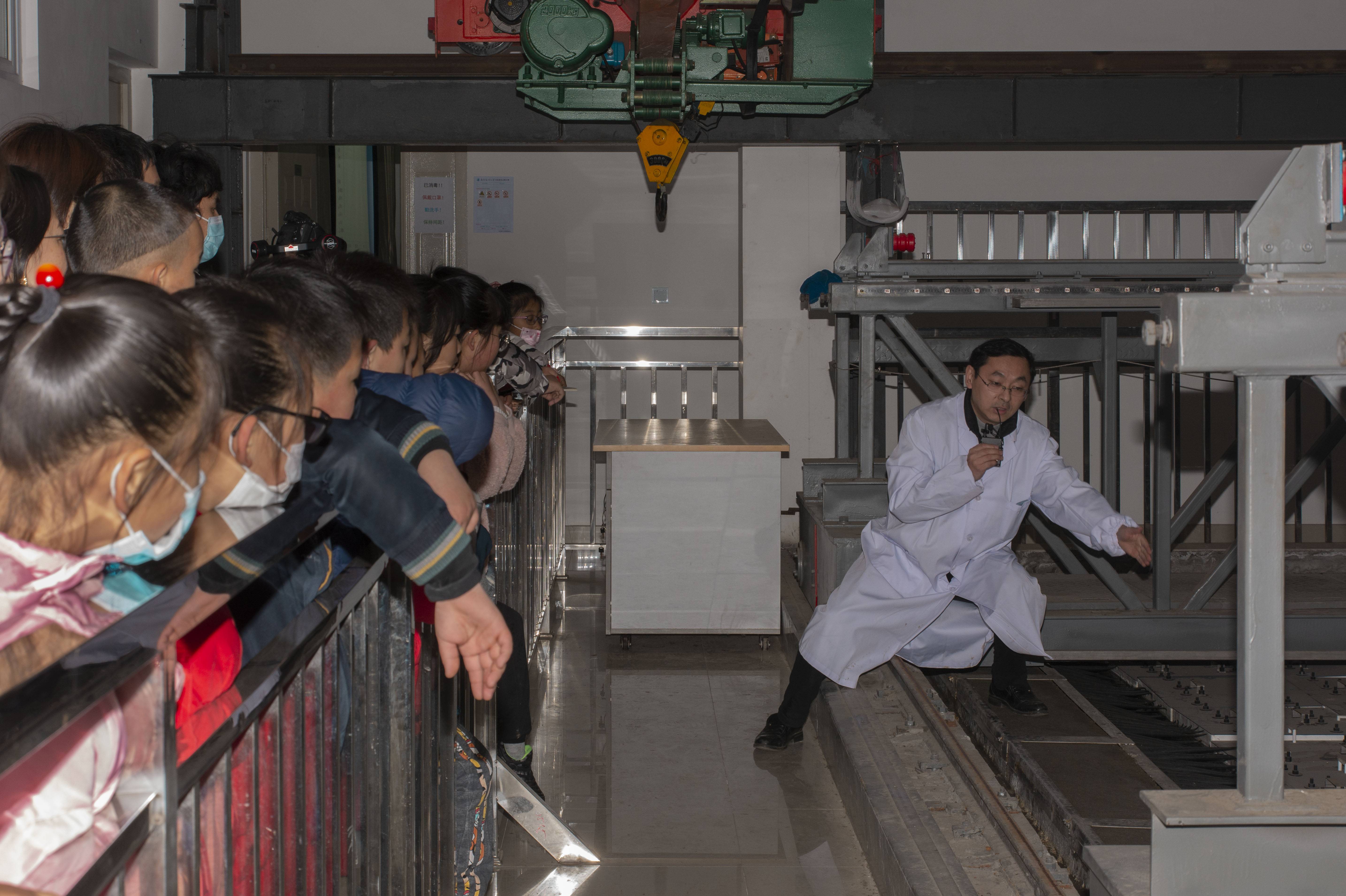 “无风三尺浪”背后有着怎样的奥秘?讲解员刘刚带领小朋友们走入风波流水槽实验室,他先启动了风波流水槽,小朋友们不约而同地围在水槽前,“好像超声波!”,周正宇小朋友兴奋地喊道。接着老师通过一系列技术调整,带领小朋友们见证了一个又一个水面波浪的产生和消亡,看到讲解员扔到水面的小球没有随着波动而移走,“它没动!”小朋友们都激动地跳了起来。