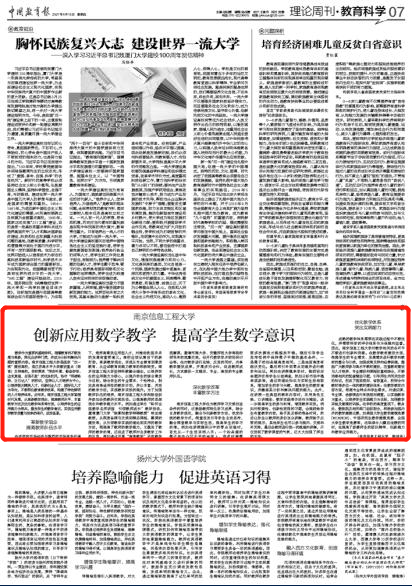 数学作为重要的基础学科,随着教育的不断发展与革新,深化出多种门类,并成为分析和解决问题的重要内容。南京信息工程大学是国家“双一流”建设高校,是江苏高水平大学建设重点(培育)支持高校。学校秉承“艰苦朴素、勤奋好学、追求真理、自强不息”的优良校风,恪守“明德格物、立己达人”的校训,坚持以人才培养为中心,以培养拔尖精英人才、创新创业人才、国际化人才为导向,不断深化教育教学改革,构建了特色鲜明的人才培养体系。近年来,南京信息工程大学紧随时代发展,从革新教学观念、提高教师水平、丰富教学方法及优化教学体系等方面,以培养学生的应用能力为根本,激发学生的数学意识,实现应用数学教学质量与效率的得升,成效显著。