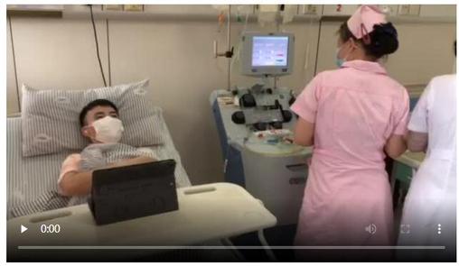疫情期间,亲人朋友们只能通过视频看到金安志状况,画面里的他两条手臂都插着导管,躺在病床上,刚刚完成捐献的他略有些疲劳,但眼神十分坚定。