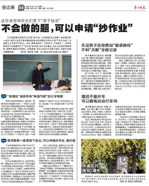 不会做的题目居然可以申请“抄作业”,这到底是怎么回事?每学期的第一堂课,南信大应用气象学院的蒋晓龙老师都会和学生们签下“君子协定”,内容听上去有些不可思议。对此,蒋晓龙表示,“与其挡水,不如疏水”, 如果有同学因不会做题而打了“抄作业”的申请,他不仅会通过,还会主动提供思路清晰、逻辑严谨的优秀答案。但前提是,学生必须在交书面作业时,当面对他阐述解题思路。 通讯员 周宏怡 白雪 扬子晚报/紫牛新闻记者 杨甜子