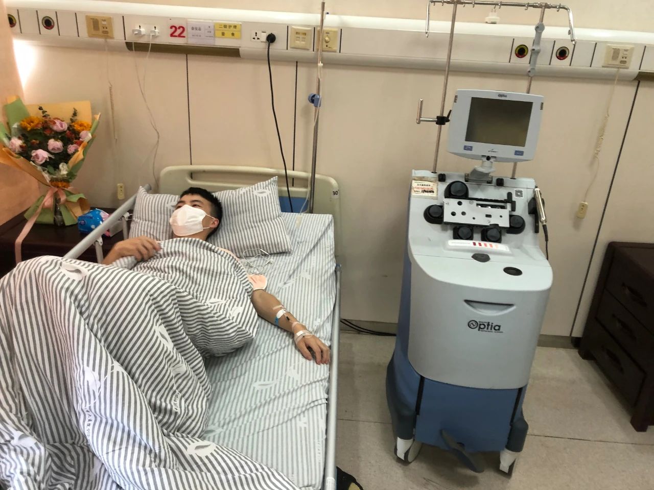 7月29日,金安志住进东南大学附属中大医院,连续5天每天注射一针粒细胞集落刺激因子,保证造血干细胞被充分地动员起来。因为注射动员剂,金安志晚上经常腰酸得睡不着,可是他谁也没说,默默忍受着,还笑着安慰别人:“这些都是正常反应,我能坚持的。”因为疫情,亲人朋友们不能到院探望,只能通过视频了解金安志状况。画面里,金安志两条手臂都插着导管,即便戴着口罩,也能看出因为刚刚完成捐献人显得有些疲倦。