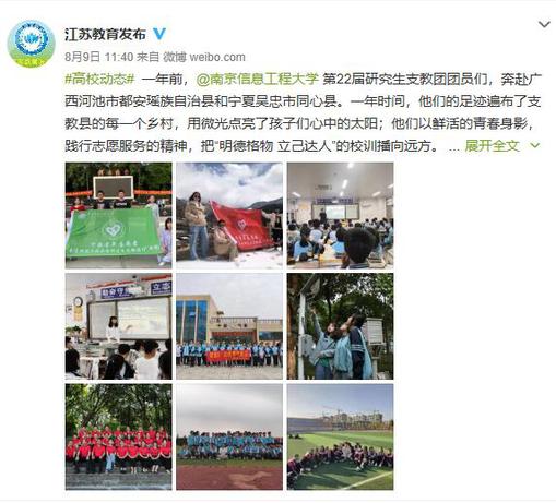 #高校动态# 一年前,@南京信息工程大学 第22届研究生支教团团员们,奔赴广西河池市都安瑶族自治县和宁夏吴忠市同心县。一年时间,他们的足迹遍布了支教县的每一个乡村,用微光点亮了孩子们心中的太阳;他们以鲜活的青春身影,践行志愿服务的精神,把“明德格物 立己达人”的校训播向远方。