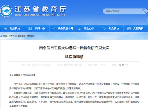 2月18日,2022年全省教育工作会议召开,南京信息工程大学第一时间通过多种途径关注全省教育工作会议,并就做好会议精神贯彻落实作了安排部署,以实干谱写推进一流特色研究型大学建设新篇章。