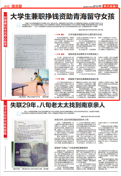 “我是一名来自青海省海北三中的高一学生,我叫马小萍。近期我收到来自您学院一位大哥哥的爱心资助金,他没有留下联系方式,我只知道他姓王,在山东滨州通过给别人当乒乓球陪练赚了2000元,并想用这笔钱做一件对社会有意义的事情。希望您能帮我找到他,并将我的谢意转达给他……”近日,来自青海的一封感谢信出现在南京信息工程大学法政学院院长的办公室。这背后是怎样的一个故事?
