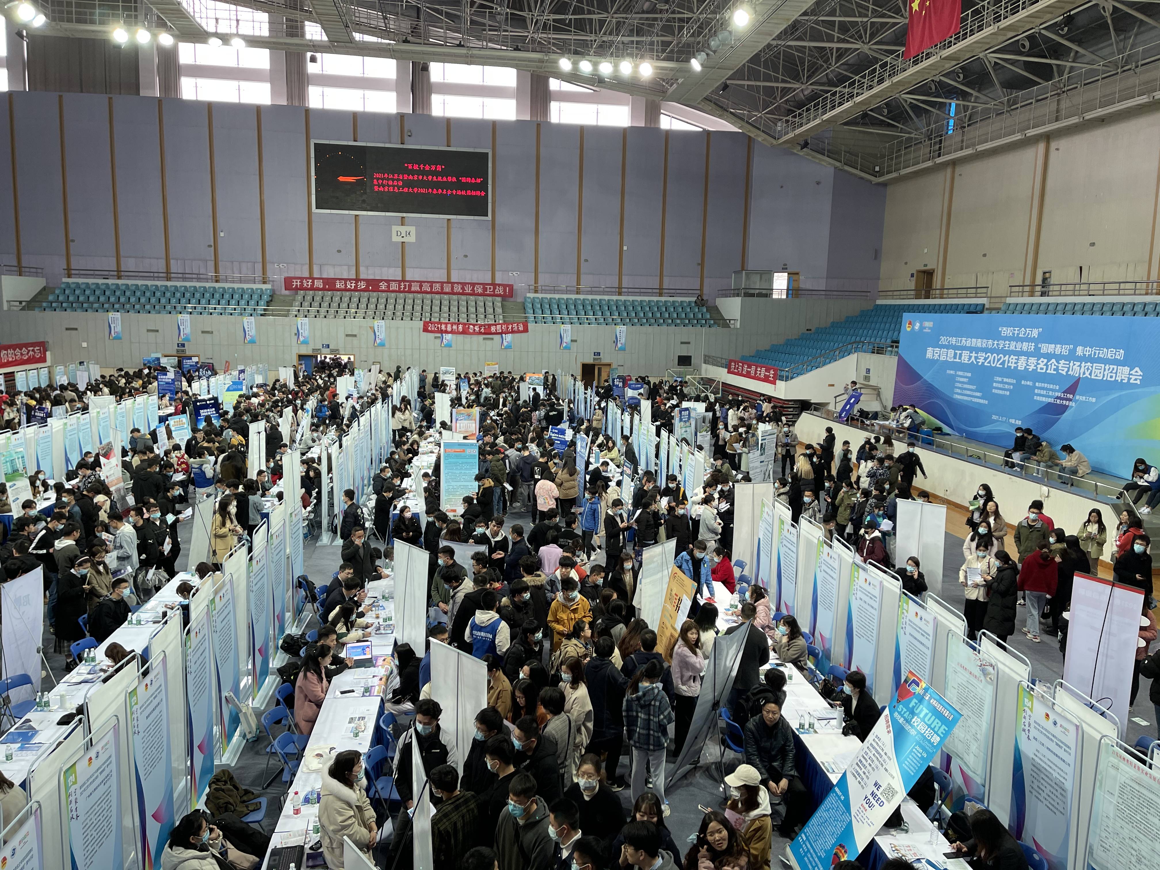 3月17日,“百校千企万岗”2021年江苏省暨南京市大学生就业帮扶“国聘春招”集中行动暨南京信息工程大学2021年春季名企专场校园招聘会启动仪式在南京信息工程大学体育馆举办。