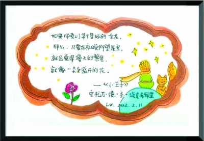 对艺术的追求遇上辅导员繁忙的工作,不但没有彼此牵制,反而相辅相成。2020年,刚接手分流而来的大三学生,刘伟感受到了学生们的不适应和焦虑。与一位女生的聊天过程中发现,即使热情阳光、成绩优异的她,内心也非常的焦虑和孤独。和学生分别后,刘伟有感而发地给女生写了一句鼓励的话,并且设计了简单的边框,没想到女生十分喜欢,还主动“讨要”彩色升级版。从此两人敞开心扉,无话不谈。2022年初,女生因为学业中的小挫折,刘伟还送去一幅女生最喜欢的“小王子”安慰她。