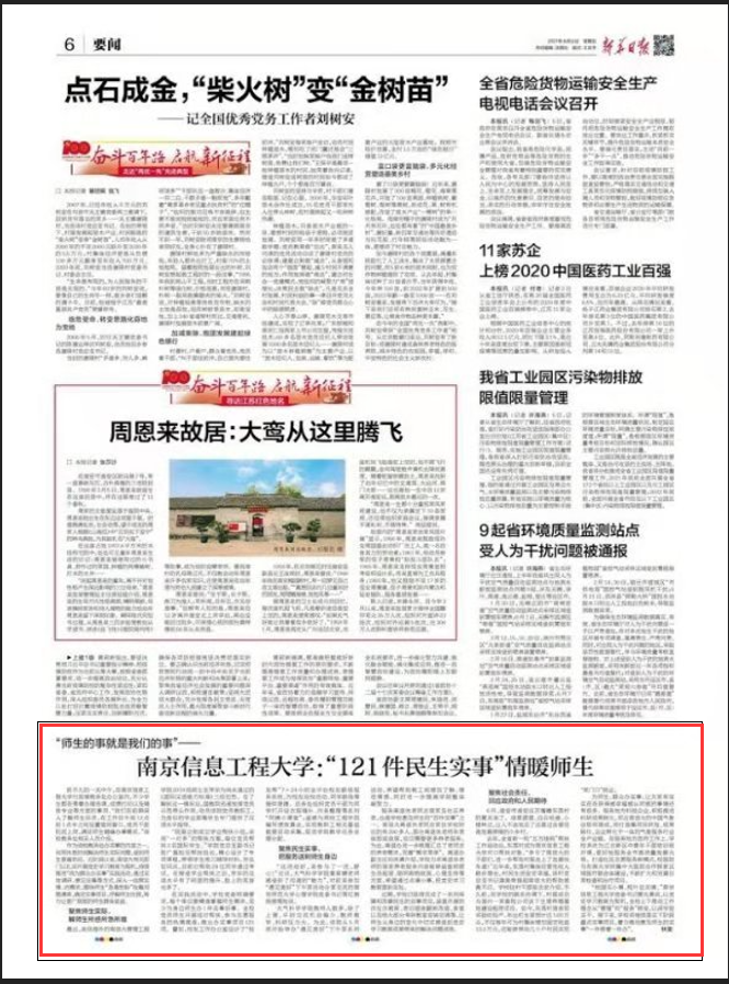 “校园无小事,枝叶总关情。”南京信息工程大学党委书记管兆勇说,以党史学习教育为契机,全校上下推动工作理念从“管理”向“服务”转变,以深学促实干。接下来,学校将继续落实下阶段重点实事项目,着力推动惠及师生的实事“一件接着一件办”。