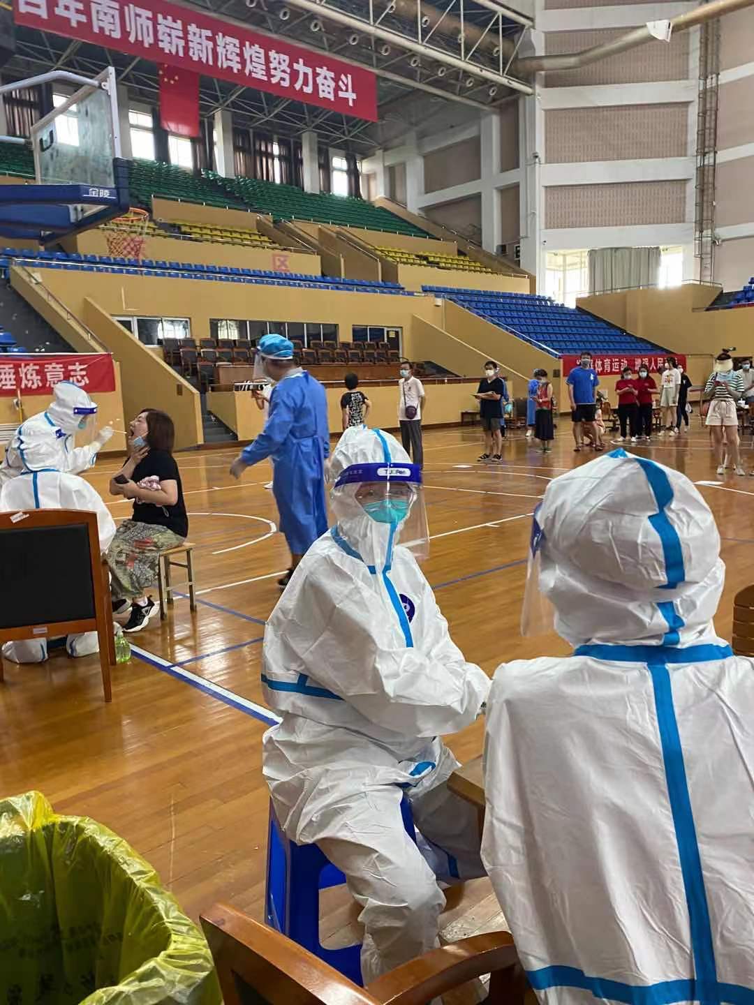 这也是南京中医药大学“95后”教师王岩工作后的第一个暑假,本打算忙完这一阵就准备回老家看望家人,但疫情来得突然,她打算留在南京,并为这座城市做些事情。学校发出志愿者招募通知时,还在实验室忙碌着的王岩立马报名了。在三尺讲台,王岩是并没有比学生大几岁的“小老师”,在志愿服务现场,王岩变成了不知疲惫的“小马达”。抵达南京师范大学体育中心核酸检测点,穿上厚厚的防护服,戴上护目镜、隔离面具之后,王岩开始了样品收集、样品包装的工作。天气又热又闷,几个小时的时间里,王岩没有休息过一秒钟,身上的防护服早已经湿透,为了不上厕所,她工作期间没喝一口水,几乎脱水,但她还是全神贯注地采集、封装,让核酸检测顺利地进行。“我没有想很多,只是觉得这是我该做的事情。”王岩告诉记者。“我的外公是一位老党员,他一直以身作则,教育我要勇于担当、乐于奉献,当他得知我报名了志愿者之后,非常开心,还不忘提醒我做好防护措施。”争先恐后帮忙搬运医疗物资的同事、核酸采样后为工作人员送水的市民、奶声奶气说着“谢谢”的小朋友……志愿服务已经结束了,但那些美好的瞬间都永远记录在了王岩脑海里。
