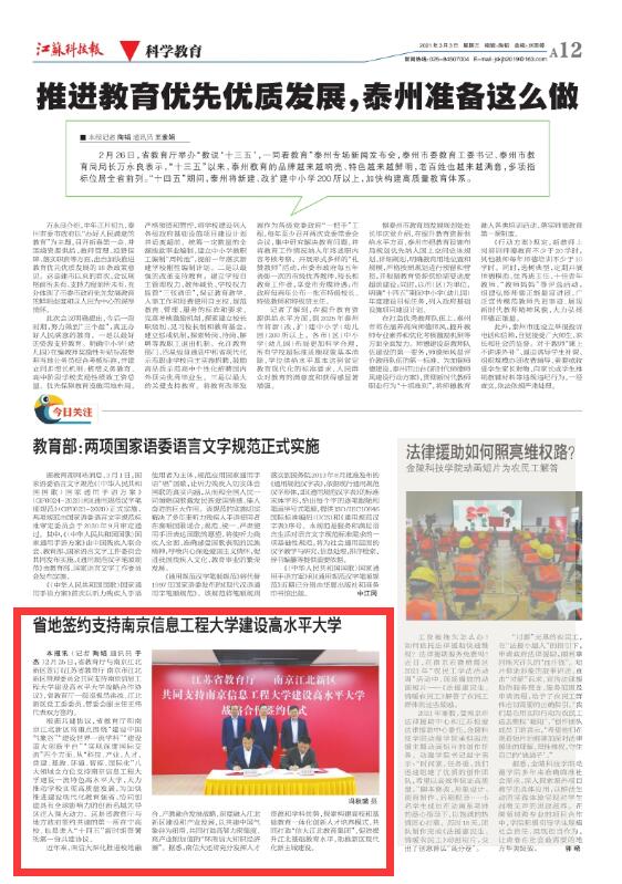 2月25日,省教育厅与南京江北新区签订《江苏省教育厅南京市江北新区管理委员会共同支持南京信息工程大学建设高水平大学战略合作协议》,省教育厅一级巡视员洪流、江北新区党工委委员、管委会副主任王伟代表双方签约。