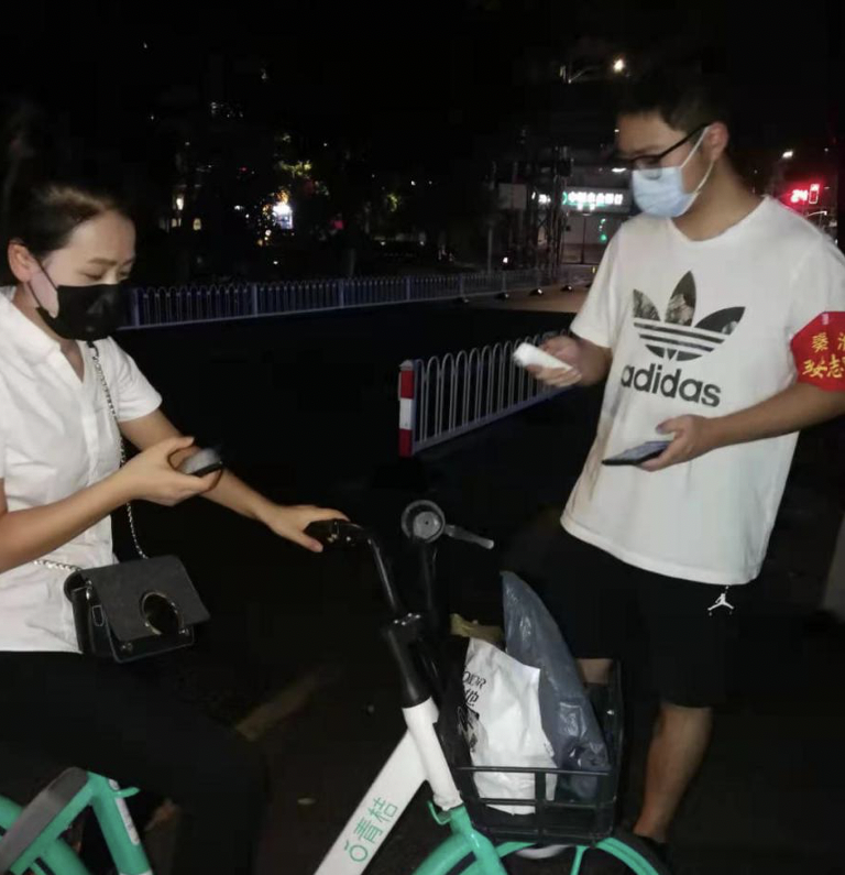 不仅在核酸检测点能看到南信大学生志愿者,基层社区也活跃着他们的身影。储勖暂停了在中山陵游客服务中心的志愿服务后,又志愿到南京市洪武路街道担任夜班防疫检测员。他克服了蚊虫叮咬、瞌睡来袭和久站腿酸的挑战,认真做好社区夜晚进出人员的体温测量和苏康码查验工作,为共同抗疫贡献青年人的力量。储勖表示,在志愿服务过程中,自己对身边连续工作、任劳任怨的工作人员肃然起敬,“大家都是在为健康南京贡献自己的力量,作为青年人,我们更加应该有担当意识。”