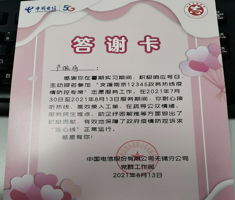严璐绮同学主动报名参加“支援南京12345政务热线疫情防控专席”志愿服务工作。从7月30日至8月13日,严璐绮周末无休,每天和搭档轮班接听市民来电,最多时要接听50多通热线,平均每分钟都能接到咨询,电话响个不停。面对巨大的咨询量,严璐绮顶住压力,学习每日更新脚本,尽可能回答市民提出的各类问题,不能回答的问题及时录入工单,上报有关部门进行反馈处理,做好民众与政府之间的桥梁。