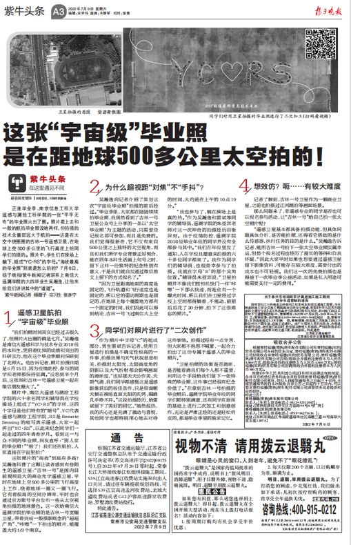 吴瀚逸向记者介绍了策划这次“宇宙级毕业照”拍摄的前后经过。“毕业季里,大家都在陆陆续续拍毕业照,我偶然看到了吉林一号卫星公众号上分享的一条以‘太空毕业照’为主题的活动,只需要登记报名即可参加,而且是免费的。我们觉得很新奇,它不仅有来自500公里之上独特的太空视角,而且和我们所学专业背景正好契合,能在四年本科生活画上句号之时,留下这样一份独特的纪念特别有意义,于是我们就自发通过微信推文上留下的方式报名了。”