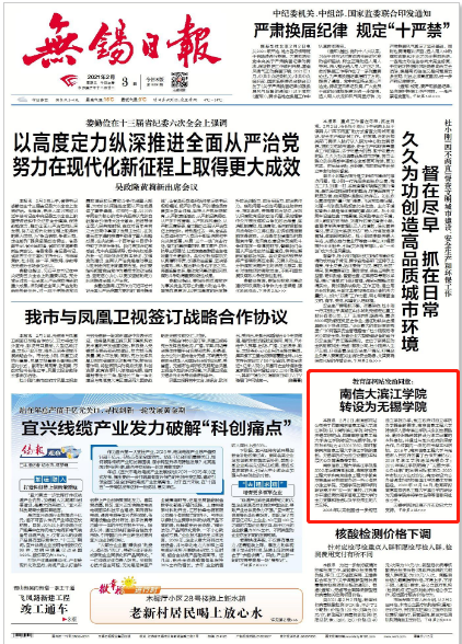 本报讯 2月2日,教育部网站公布关于同意南京信息工程大学滨江学院(以下简称滨江学院)转设为无锡学院的函,同意南京信息工程大学滨江学院转设为无锡学院,学校标识码为4132013982;同时撤销南京信息工程大学滨江学院的建制。无锡学院成为独立设置的本科层次公办普通高等学校。
