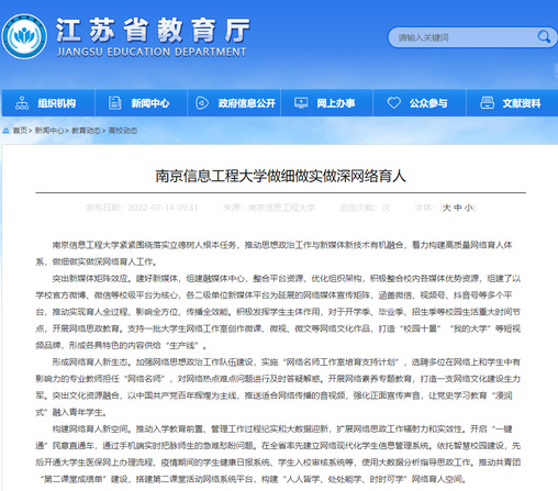 南京信息工程大学紧紧围绕落实立德树人根本任务,推动思想政治工作与新媒体新技术有机融合,着力构建高质量网络育人体系,做细做实做深网络育人工作。