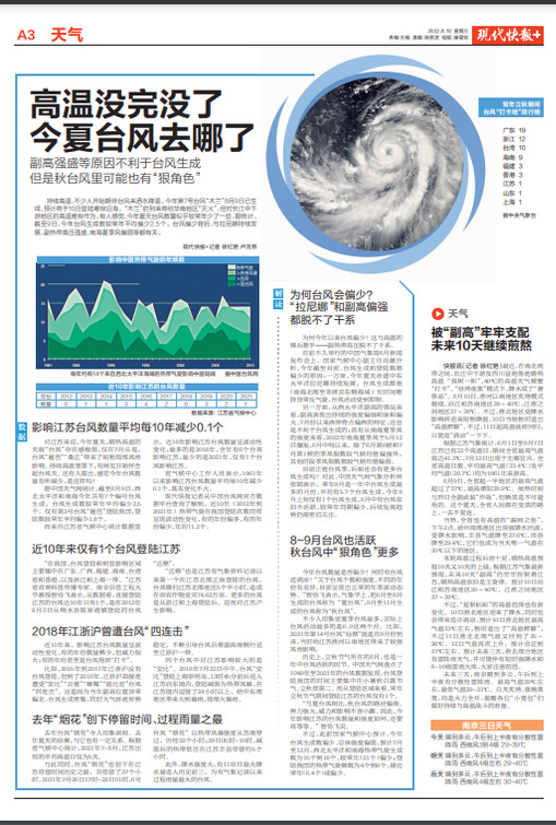 去年台风“烟花”令人印象深刻。去年夏天的凉爽,与它也有一定关系。根据省气候中心统计,2021年7~8月,江苏出现的平均高温日仅为5天。