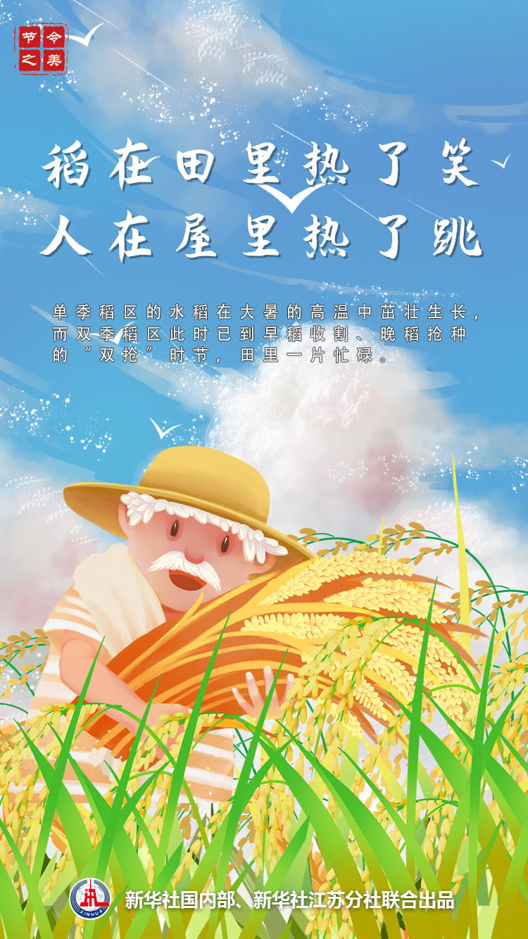 炎热的大暑是农作物生长最快的时节。农谚“稻在田里热了笑,人在屋里热了跳”说的就是此时的景象。江苏省农科院副研究员乔俊卿说,单季稻区的水稻在大暑的高温中茁壮生长,而双季稻区此时已到早稻收割、晚稻抢种的“双抢”时节,田里一片忙碌。