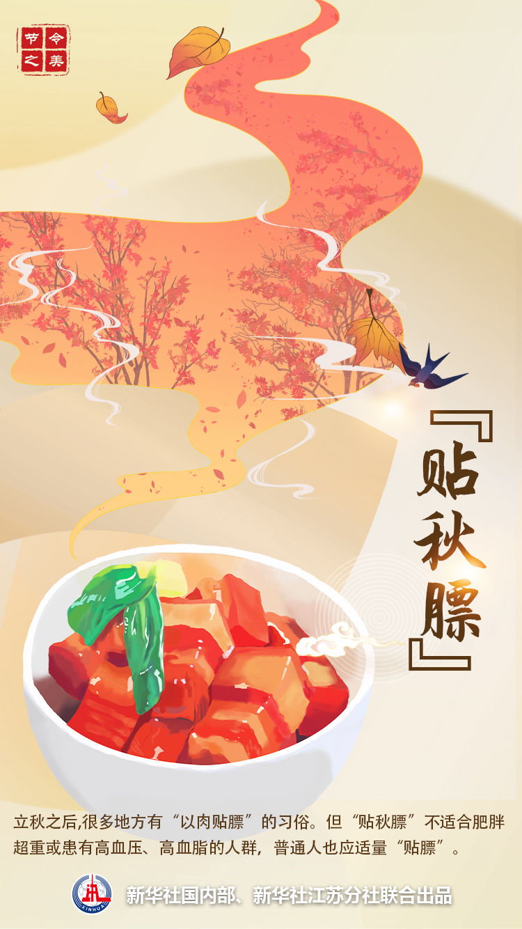 “人们一般还会选择在立秋日吃肉,意在‘以肉补膘’。”羊杏平解释说,但从营养学的角度讲,“贴秋膘”不一定非得吃肉,尤其不适合肥胖超重或患有高血压、高血脂的人,建议多吃绿叶菜、薯类、馒头、酸奶等发酵类的食物,少吃肉类。普通人群“贴秋膘”也要适量,不宜暴饮暴食。