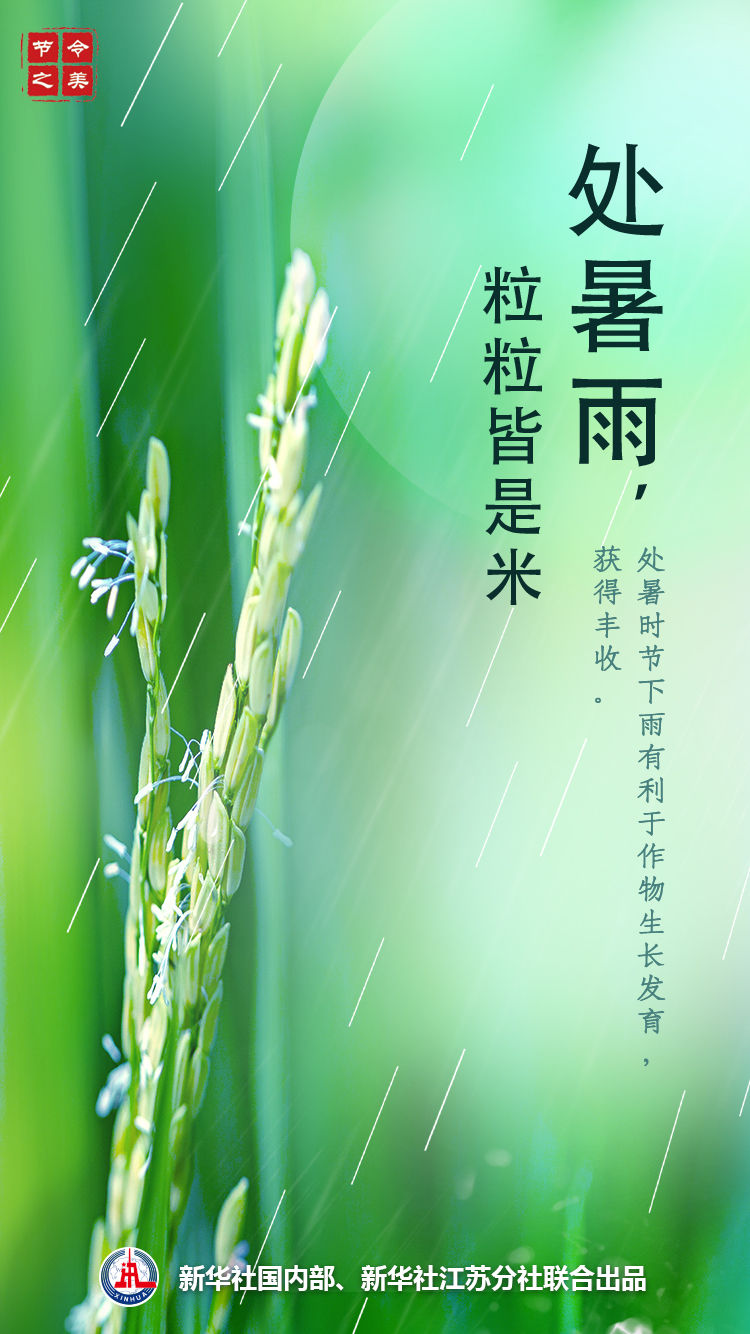 江苏省农业科学院农业资源与环境研究所研究员宁运旺介绍,处暑后,我国大部分地区林果和农作物陆续进入成熟期。农民们会抢抓农时,进行水稻施肥、除草等田间管理。这一时节,秋熟作物多处于籽粒开始形成或充实时期,水稻一般处于孕穗期,对水分需求很大。此时下雨有利于作物生长发育、获得丰收,因此有“处暑三朝稻有孕”“处暑雨,粒粒皆是米”等农谚。