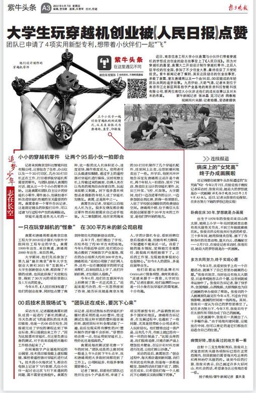 近日,南京信息工程大学小伙袁霄与小伙伴们带着穿越机的梦想成功创业的励志故事登上了《人民日报》。因为对穿越机的喜爱,袁霄大二开始设计制作穿越机零件,之后入驻学校的创业园,参加了不少创业大赛,最终收获了天使轮投资。紫牛新闻记者了解到,其实这段励志的创业故事里,承载了袁霄、室友唐靖雨以及一个由95后、00后组成的年轻团队共同的追梦故事。九月伊始,天朗气清,记者来到位于南京市江北新区网易数字产业基地的南京奈科拉智能科技有限公司,听两位南信大小伙讲述他们的成长故事以及对未来的希冀。