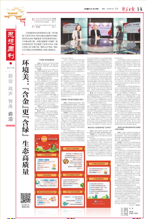 江苏省哲学社会科学规划办公室、“学习强国”江苏学习平台、新华日报社全媒体评论理论部共同主办的“强富美高”五年答卷系列访谈,今天推出第三期。本期主题聚焦“环境美”,相关内容同步在“学习强国”江苏学习平台、中国江苏网、交汇点客户端、“理论之光”网站、“理论之光”微信公众号等新媒体上呈现,敬请关注。