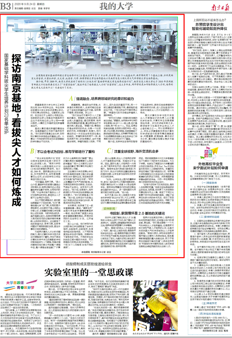 采访中,记者了解到,拔尖人才2.0基地在1.0版本上进行了升级,除了增加人文类学科外,在培养上更强调老师和学生的交流,培养学生的家国情怀、科学精神。