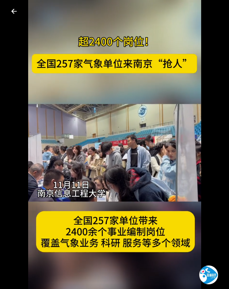 #南京本土视频新闻最快发布#【超2400个岗位!#全国257家气象单位来南京“抢人”#】今天,全国气象部门2025年度人才招聘会走进南京信息工程大学。远洋导航、⽣态环境、信息技术、数学物理……今年,气象行业对跨学科、复合型人才需求更加旺盛。