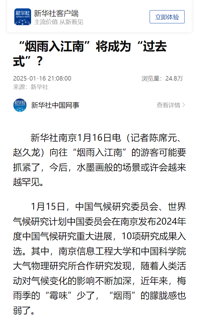 1月15日,中国气候研究委员会、世界气候研究计划中国委员会在南京发布2024年度中国气候研究重大进展,10项研究成果入选。其中,南京信息工程大学和中国科学院大气物理研究所合作研究发现,随着人类活动对气候变化的影响不断加深,近年来,梅雨季的“霉味”少了,“烟雨”的朦胧感也弱了。